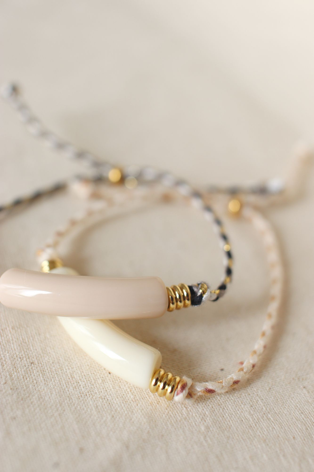 Coloris : Cordon tressé noir/blanc/or - perle centrale beige moka opaque.