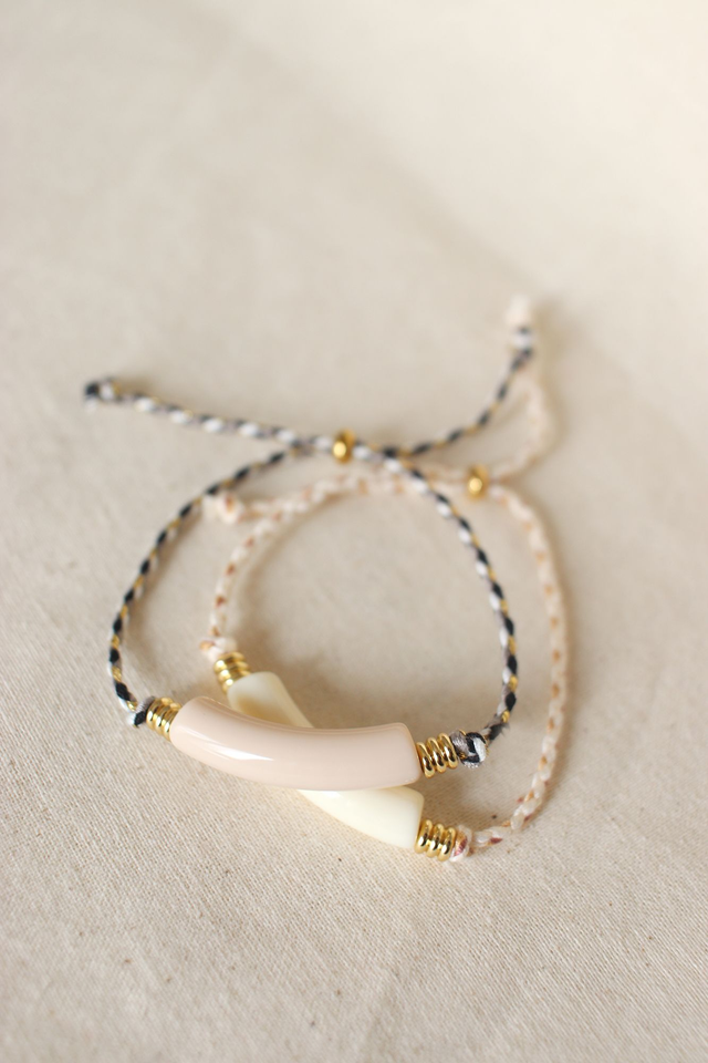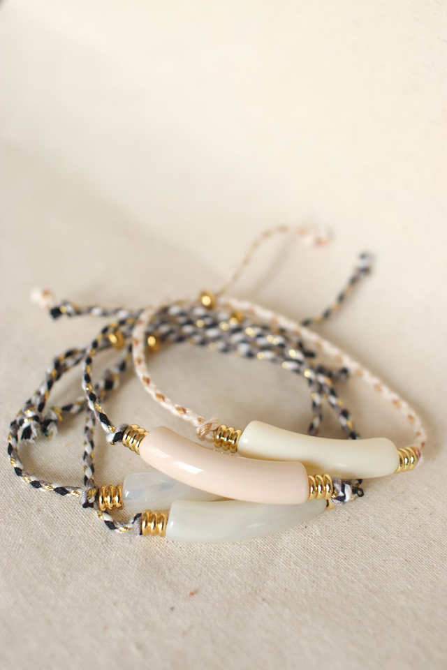 Cordon coton / Perle centrale acrylique / perles dorées acier inoxydable.