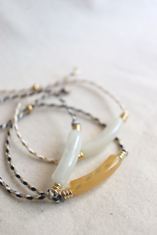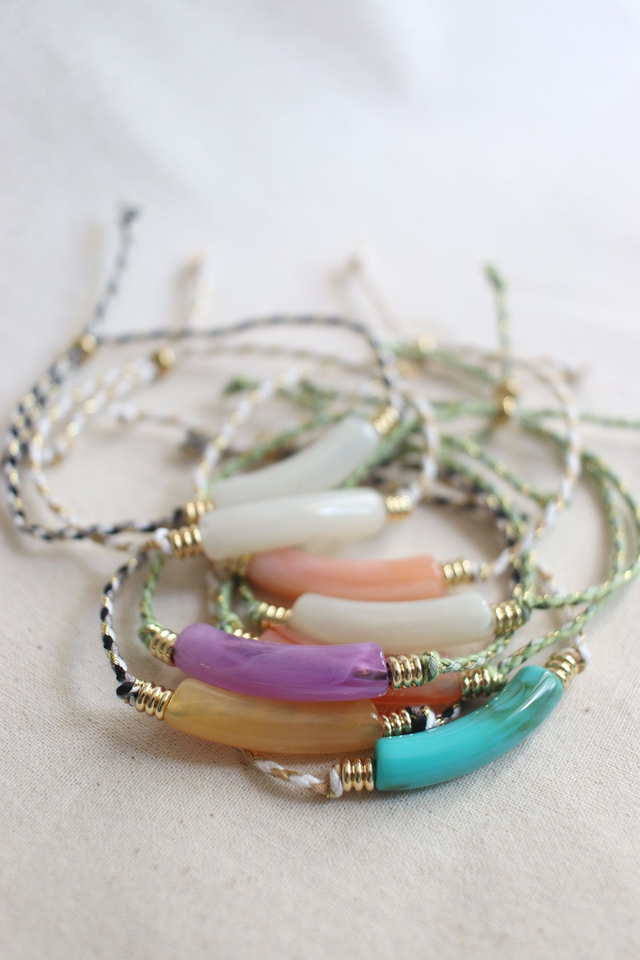 Cordon coton / Perle centrale acrylique / perles dorées acier inoxydable.