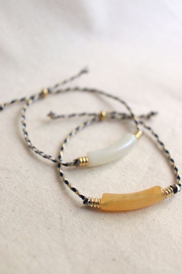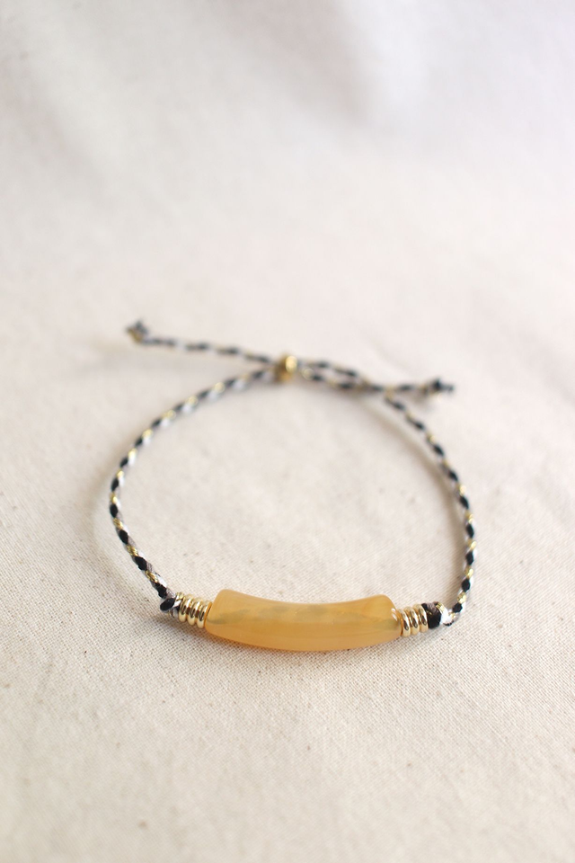 Coloris : Cordon tressé noir/blanc/or - perle centrale jaune légèrement transparente et marbrée. Attention la couleur de la perle centrale peut légèrement varier d'un modèle à l'autre.
